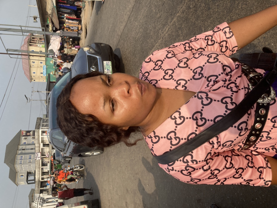 A forensic description of the image reveals a bustling urban street scene in Aba, Nigeria, specifically identifiable near the Osisioma Junction due to the prominent multi-story grey building and the white spherical monument resembling a soccer ball on a pedestal. In the foreground, a light-skinned female with dark curly hair, parted slightly off-center, faces slightly right with a pursed mouth. She is wearing a pink V-neck garment patterned with repeating black "GG" logos. A black strap is visible across her right shoulder, and a black belt with silver eyelets and a decorative silver buckle is worn around her waist. The background depicts a busy asphalt road with traffic. A dark grey Lexus SUV, bearing Nigerian license plate "SSM 51BRO," is centrally positioned behind the female subject. Further back on the left, a motorcycle with two riders, one in an orange shirt, is visible near a white vehicle. Various pedestrians are present on the street. To the far left, a multi-story grey building with multiple windows features a banner displaying a person and the partial word "KING." To the right, a line of informal market stalls with corrugated roofs displays clothing and other goods, extending along the roadside. Overhead, utility poles and wires are visible. Bright daylight illuminates the scene, casting noticeable shadows on the ground.
