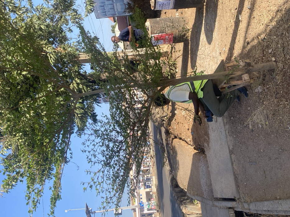 The image captures an outdoor scene in Barnawa, Nigeria, under a clear blue sky. In the foreground, a person with dark skin wears a light-colored shirt, a reflective yellow-green safety vest, dark trousers, and dark shoes. This individual is seated on a makeshift wooden bench beneath a leafy green tree, facing towards the left. Their hands are engaged with a small, dark object (possibly a mobile phone) and some green leaves. To the right of this person, further back and partially obscured by tree foliage, a second person with dark skin stands wearing a dark blue short-sleeved shirt and dark trousers, holding a dark object in their right hand. This individual is looking towards the left. The immediate ground consists of dry soil and a partially constructed or damaged concrete pathway. A dark, paved road runs horizontally across the midground, bordered by a concrete gutter or drainage ditch. In the background, across the road, various commercial buildings are visible, some with indistinct signage. On the far left, a utility pole with solar panels stands against the sky. Two dark, cylindrical objects, possibly barrels or bins, with attached papers/posters, are located to the right of the seated individual. Shadows indicate a bright, sunny day.