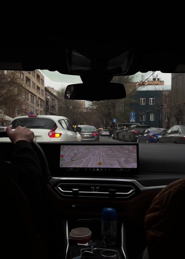 The interior of a car is shown from a driver's point of view. The driver is using the car's navigation system to navigate through a city street. The street is lined with buildings and other cars. The weather appears overcast. There are two people in the car, but only the driver's hands are clearly visible. The passenger's arm is seen in the bottom right of the frame. A cup of coffee and a water bottle are visible in the car's console.