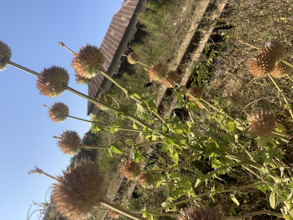 The image displays an outdoor scene in Gura Top, Nigeria, characterized by bright sunlight and clear blue skies. The foreground is dominated by multiple plants featuring prominent, spherical, spiky, and dry seed pods, predominantly light brown to tan, interspersed with green foliage. In the midground, dry, sparse vegetation covers uneven ground, with faint, parallel dark lines suggesting abandoned railway tracks running horizontally. A small, dark, quadrupedal animal is partially visible among the midground vegetation on the right. The background features a building with a light-colored facade and a distinct reddish-brown corrugated metal roof, situated on an elevated slope.