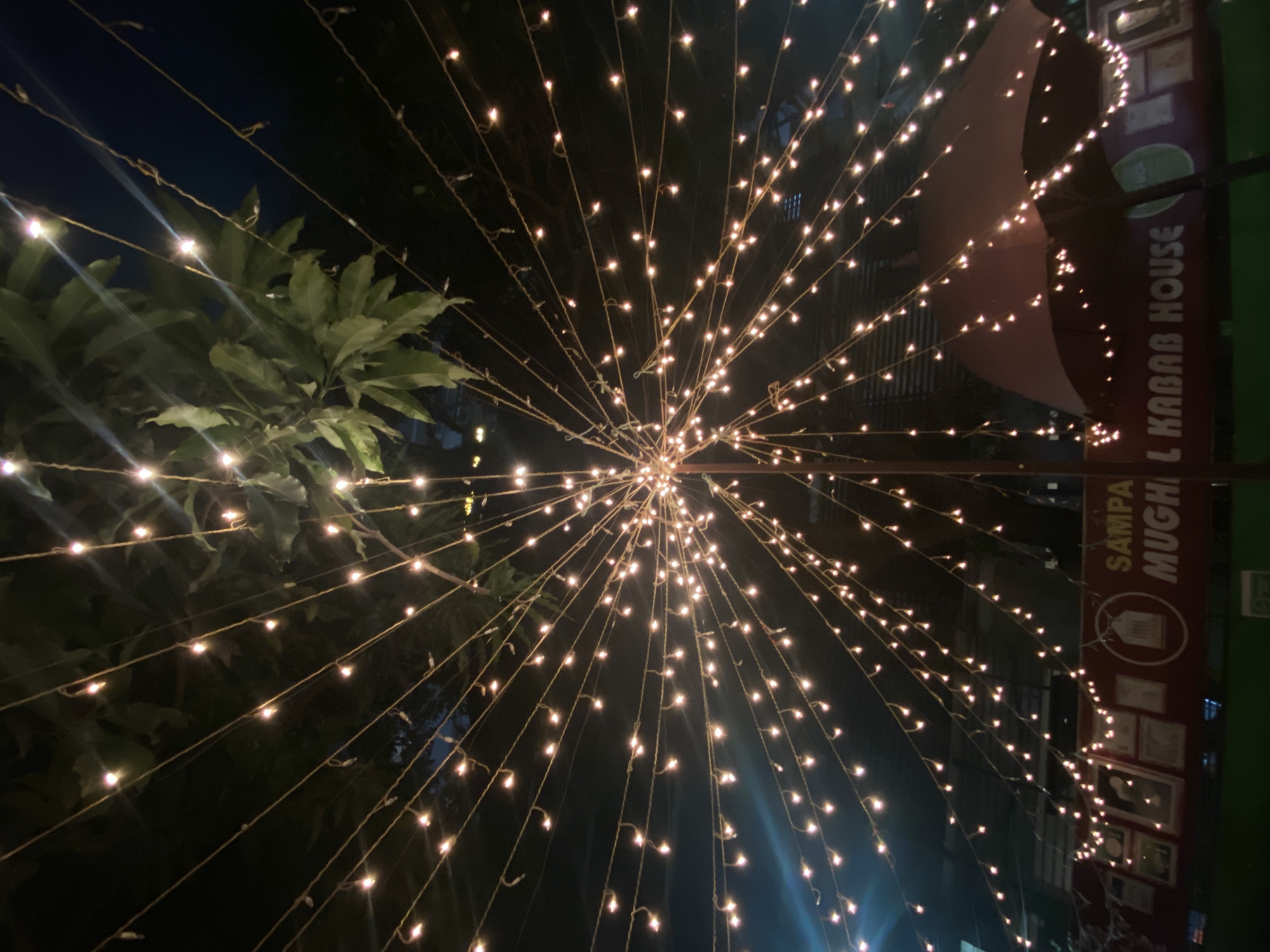 The image depicts a low-angle shot of strings of warm-toned lights radiating outwards from a central point. The lights are suspended above what appears to be an outdoor area. To the left, dark green foliage is visible, likely a tree or large shrub. To the right, a sign reads "SAMPA MUGHAL KABAB HOUSE." The image has been taken at nighttime in Dhaka, Bangladesh.