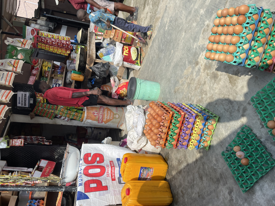 This image depicts an outdoor market stall or small shop situated in Iranla, Nigeria, under bright daylight