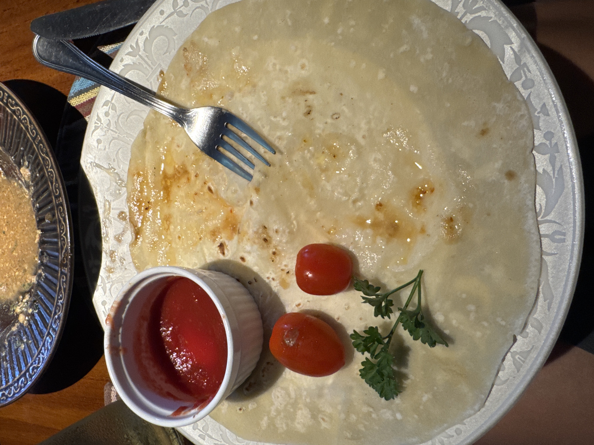A close-up overhead shot shows a meal presented on a white decorative plate, possibly in a restaurant or private residence. A large crepe-like object occupies most of the plate. A silver fork is placed on the left side of the crepe. A small white ramekin filled with a red sauce (possibly ketchup or tomato sauce) is positioned near the bottom left corner of the crepe. Two small red tomatoes and a sprig of parsley are also arranged on the crepe near the bottom right. A silver plate with what appears to be a granular food substance is partially visible on the left side of the frame. A knife is placed on a colorful napkin above the fork. The plate rests on a brown wooden surface. The location is described as North Kuta, Indonesia, although nothing in the image directly confirms this location.