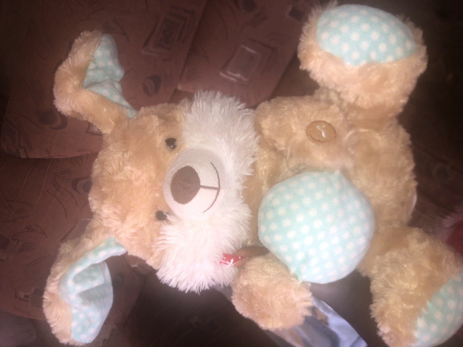 A light brown plush toy, resembling a rabbit or fox, is centrally positioned