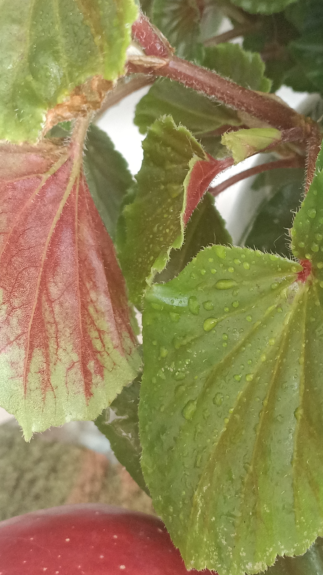 The image is a close-up of a begonia plant. The leaves are green, with some reddish-pink coloration on the underside and veins of one leaf. Some leaves have water droplets on their surface. The plant has a textured, slightly hairy appearance. A red object, possibly a fruit, is visible in the lower left corner of the frame. The location is not indicated within the image itself. There are no people, subjects, actions, or interactions visible in the image. The environment is limited to the immediate surroundings of the plant. The location of Slivnitsa, Bulgaria, cannot be confirmed within this image.
