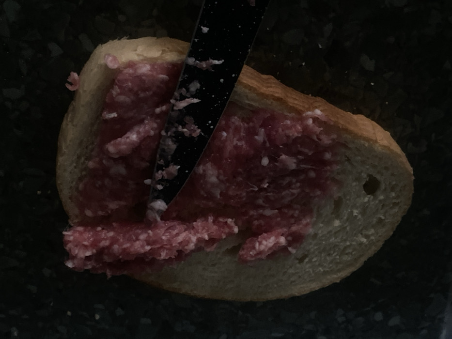 - "A close-up, top-down view captures a single slice of light-colored bread, topped with a coarse, reddish substance, consistent with minced meat or a spreadable sausage" by FM-PFEbq2, licensed under CC BY 4.0