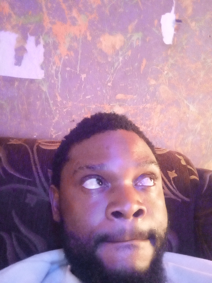 This image depicts a dark-skinned male, with a full beard and short dark hair, seated or reclining in an indoor setting in Narayi, Nigeria