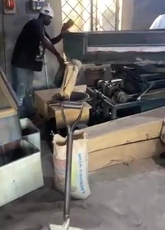 A man wearing a black t-shirt and white cap is working in a workshop. He is pouring materials from one container to another and into a machine. The workshop contains bags of cement, a shovel, and various metal containers. There is machinery nearby. Another person is visible in the background. The lighting is somewhat dim, and the room appears dusty.