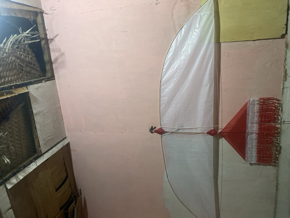 A kite hangs against a pale pink wall with white trim. The kite is white with a triangular red and white tail. The wall to the left shows a built-in structure with woven bamboo baskets inside. The wall to the upper right is yellow, with visible seams. Overall lighting suggests an indoor setting.
