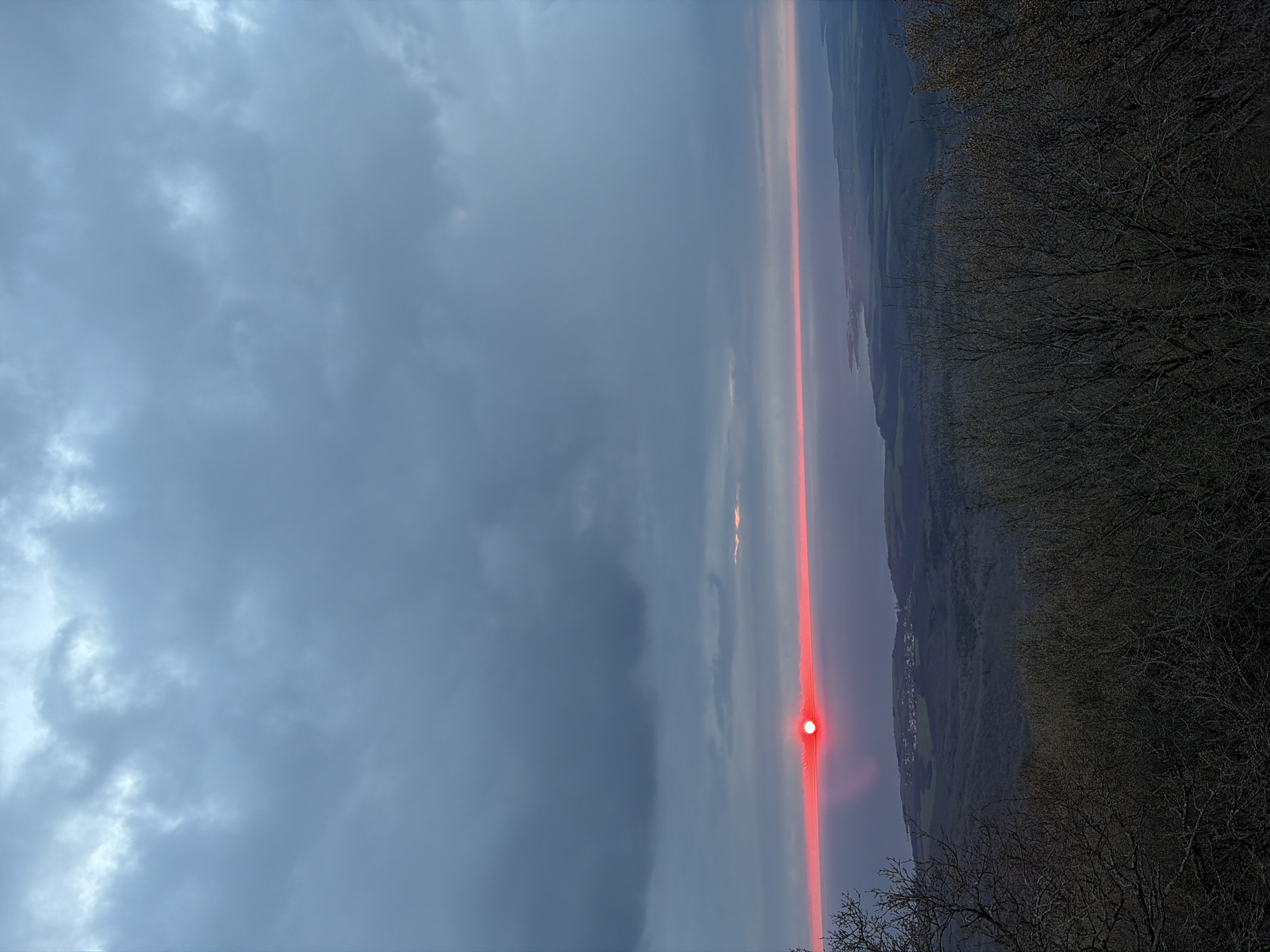 The image depicts a landscape at dusk or dawn. Overcast skies cover most of the view. A prominent red light is centered on a vertical axis near the middle of the frame, its glow extending along the water. On the right side are treed hillsides. A settlement is visible between the treed hillsides and the water. The location cannot be determined with the details of the image provided.