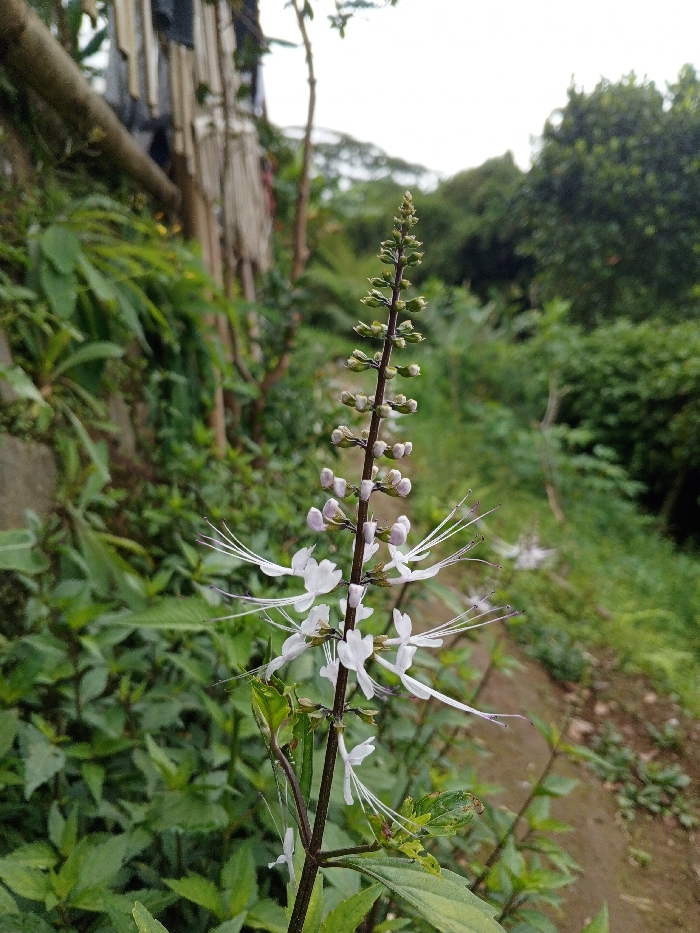 This image, taken in Weintiapa, Liberia, presents an outdoor scene dominated by natural vegetation. In the central foreground, a single *Orthosiphon aristatus* (cat's whiskers) plant stands vertically, its dark stem adorned with several open white flowers featuring prominent, long white and purple-tipped stamens extending outwards. Above these blooms, the stem terminates in a spike of numerous tightly clustered, light green and pale purple unopened buds. The immediate surroundings and midground are filled with dense, various shades of green foliage and undergrowth. To the left, a rustic, partial structure is visible, composed of vertical elements, possibly bamboo or thin wooden poles, with dark fabric or clothing draped over them, and a thick horizontal wooden beam. To the right, an unpaved, uneven dirt path or trail recedes into the background. The background itself is characterized by a thick expanse of green trees and dense vegetation, suggesting a wild or forested area, beneath an overcast, light grey sky. No individuals or animals are present in the frame.