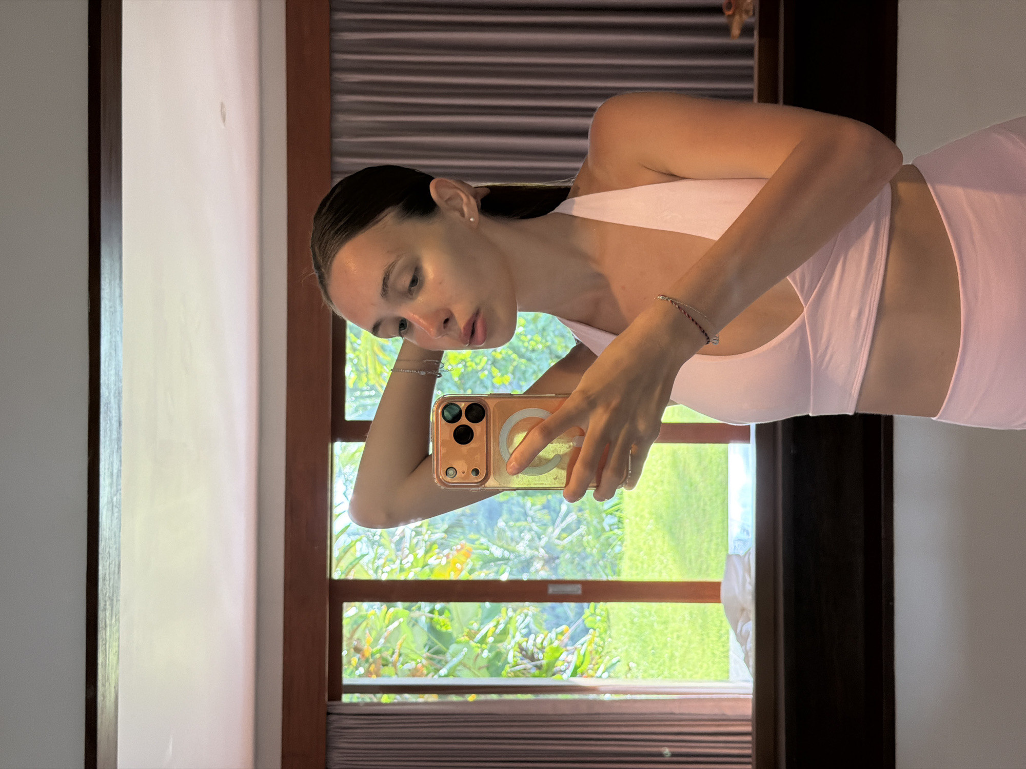 A woman takes a selfie in front of a window. She wears a pink top and holds her phone in her right hand. Outside the window, foliage and greenery are visible. The window frame appears to be made of wood. The location is likely in Petulu, Indonesia.