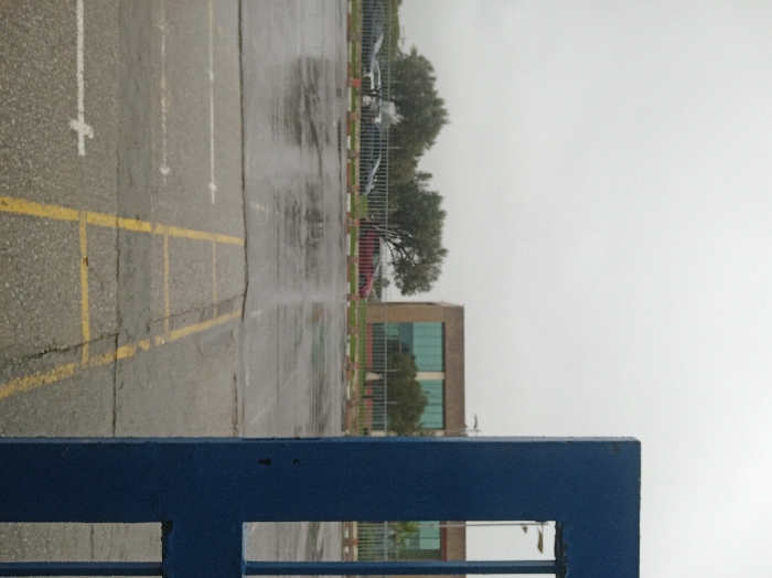 The scene is an outdoor environment in Gueznaïa, Morocco, characterized by an overcast sky and wet asphalt, suggesting recent precipitation. In the immediate foreground, on the right, a dark blue, square-section metal gate or frame is partially visible. The ground is asphalt pavement with faded yellow rectangular markings and white dashed lines. A wet asphalt parking lot occupies the midground. A metal fence, with white and orange striped low barriers along its base, separates the parking area from a further strip of land. Behind this fence, several vehicles are parked; these include multiple dark-colored cars and a red hatchback positioned to the right. Trees with dense green foliage are visible behind the vehicles and the fence. In the background, a multi-story modern building with light brown exterior walls and prominent turquoise-tinted glass windows is visible. A second, similar building is partially visible to its right. Street lights are discernible in the distance. No individuals are present in the image.