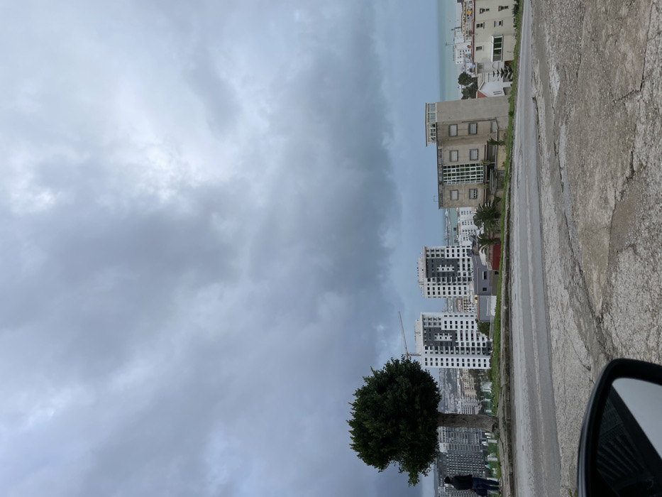 A coastal city landscape under a cloudy sky is depicted. Buildings, including apartment complexes, are scattered along the coastline. A tree stands near the edge of a road, where a person is standing, possibly observing the scene. The picture appears to be taken from a slightly elevated position, showing a portion of a car's side mirror in the corner. The overall atmosphere suggests a possibly overcast or rainy day.