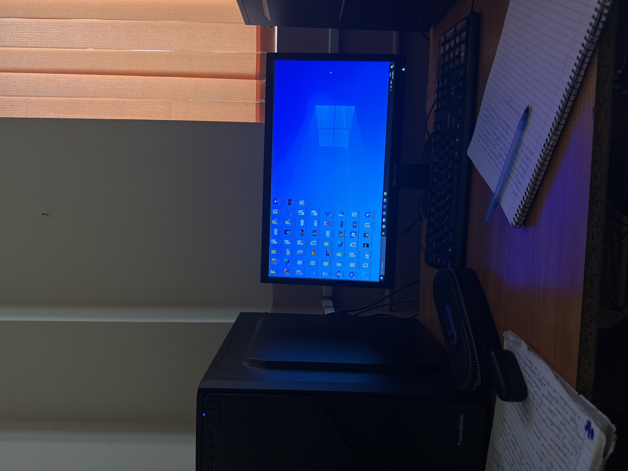 The image depicts a desk with a computer setup in Stara Zagora, Bulgaria. The setup includes a black desktop computer tower, a monitor displaying the Windows operating system, a black keyboard, and a notebook with handwritten notes and a blue pen on top. Additionally, there is a black zippered case next to the notebook. The desk appears to be made of wood, and the lighting in the room is dim, with natural light filtering through orange horizontal blinds in the background. The city is inferred from the screen's taskbar indicating it is located in Stara Zagora, Bulgaria.