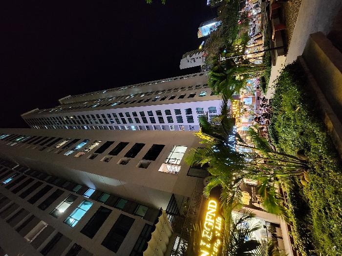 This nighttime image depicts a modern urban street scene in Nha Trang, Vietnam. Two tall, light-colored skyscrapers dominate the background, featuring numerous illuminated windows. The structure on the far left prominently displays a yellow-glowing sign reading "N LEGEND" with "Nha Trang Life" visible beneath it, confirming the city. Below this building, a commercial strip is active, including an establishment identified by a sign as "ORIZON CAFE" where several individuals are seated at outdoor tables, appearing to socialize. The foreground features a raised, well-maintained garden bed filled with lush green foliage and multiple small palm trees, all brightly illuminated by ground-level lighting. To the right of the garden, a paved walkway is visible with benches. The sky above is dark black, indicating deep night, while the street-level and building facades are intensely lit by a combination of interior lights, streetlights, and commercial signage.