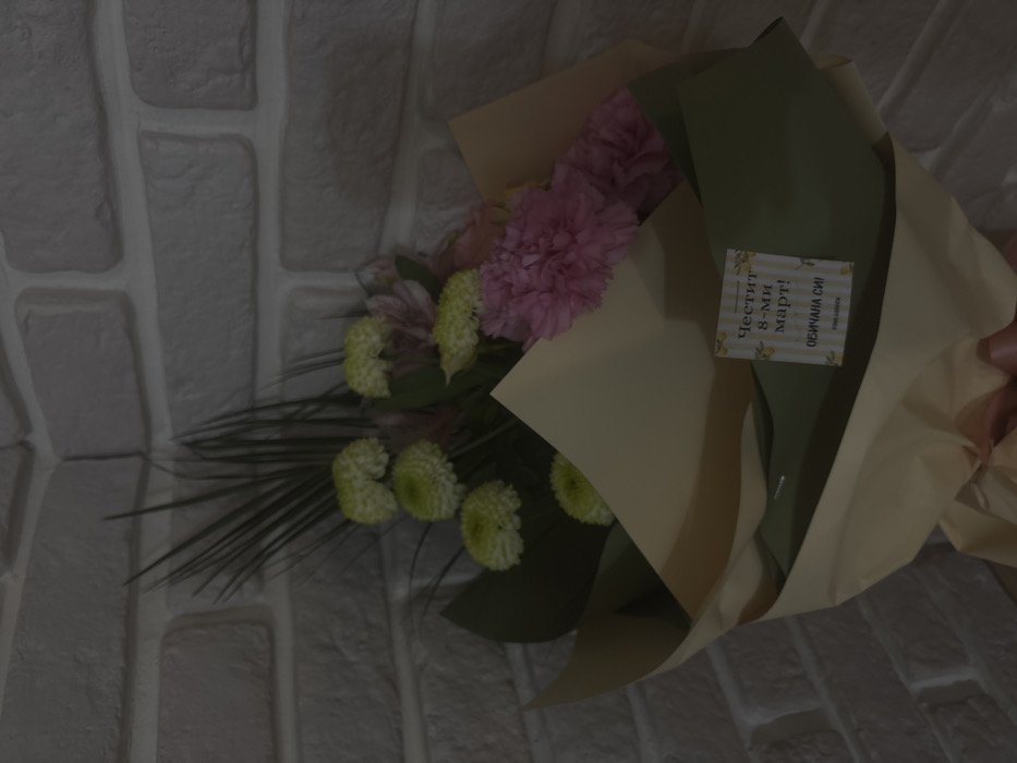 The scene, located in Karlovo, Bulgaria, displays a floral bouquet positioned against an interior corner formed by white-painted brick walls