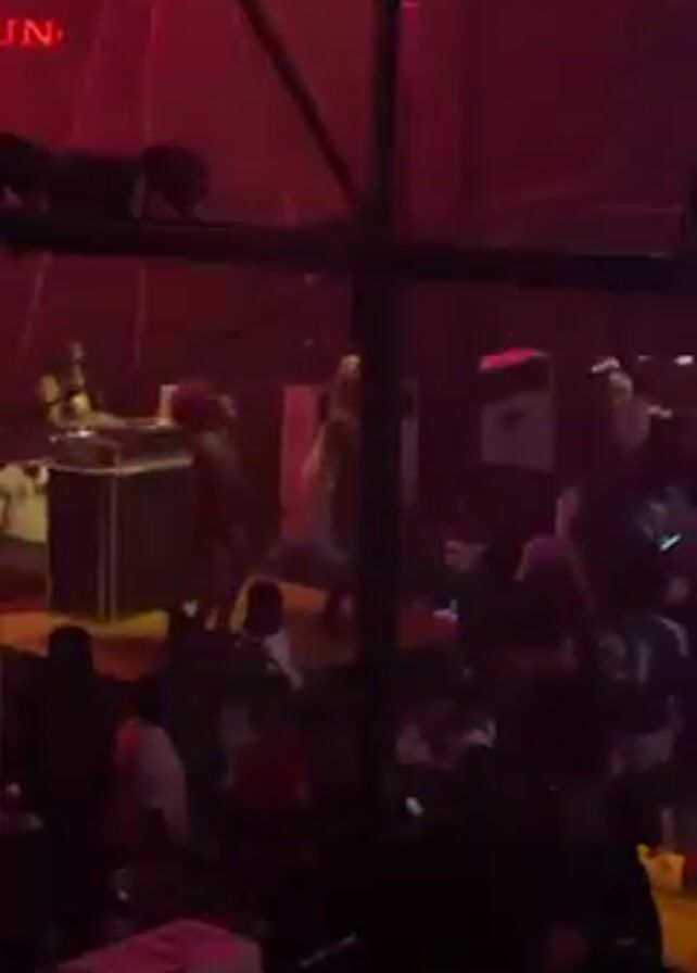 dimly lit, crowded dance club with red and green flashing lights. A DJ and dancers perform on a raised platform, while people on the dance floor move to the music. The scene is energetic and lively, indicating a party or event. A structure made of black poles is visible, partially obscuring the view.