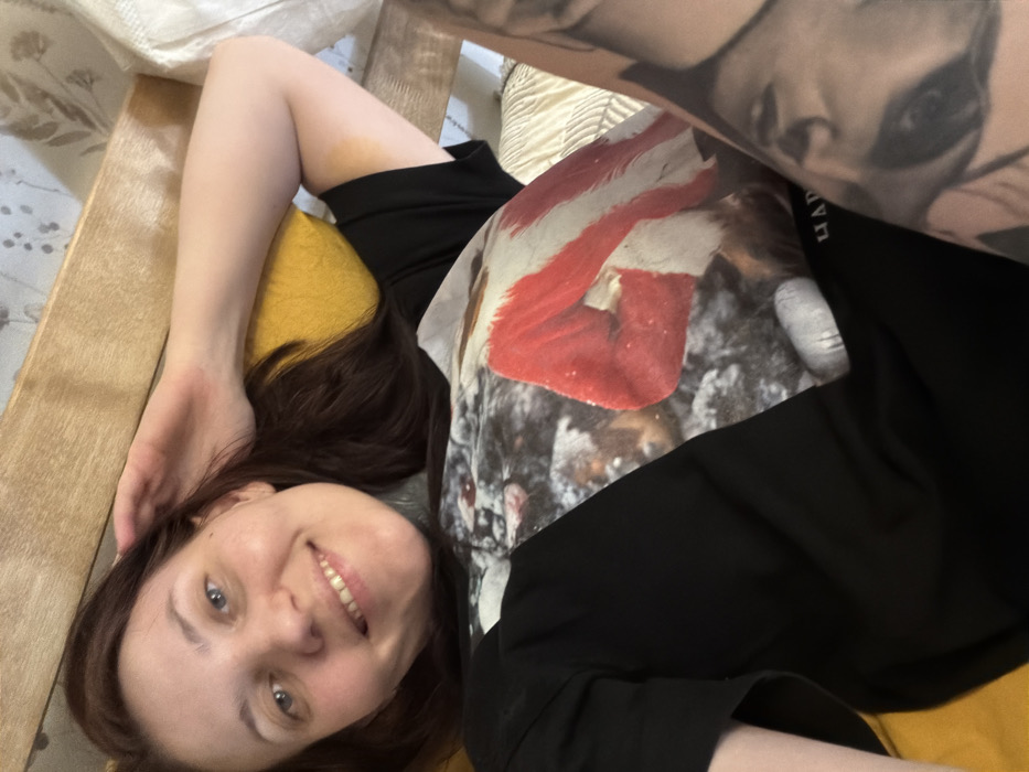 A fair-skinned woman with auburn hair smiles at the camera. She's lying down, with a black t-shirt featuring a graphic print. Part of a tattooed arm is visible in the upper right corner of the image. Her head rests on a yellow pillow, which is near wooden furniture or a bed frame. The setting appears to be indoors.