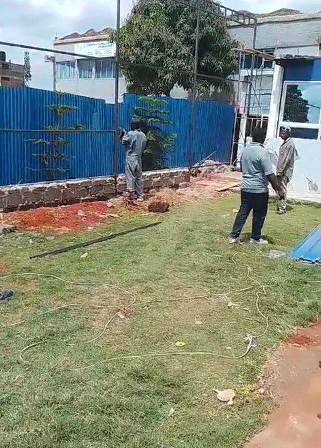 n outdoor scene with construction activities taking place. Three men are visible. One man in a gray jumpsuit is working on a blue metal fence. Another man, wearing a gray shirt and jeans, is walking across the grass. A third man in a beige uniform stands near a building. The environment includes a green lawn, some exposed red soil, and various pieces of metal construction materials scattered around. A metal frame is partially erected, and a blue metal sheet lies on the ground. A building with blue trim and white walls is also visible. The sound of metal cutting can be heard in the background.