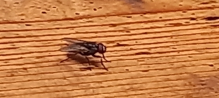 A single dipteran insect, consistent with a Musca domestica (common housefly), is observed at rest on a textured wooden surface