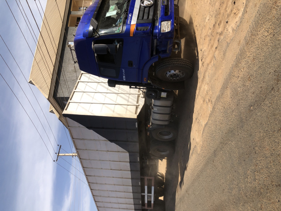 - "A blue FOTON ETX 2542 semi-truck, connected to a white and black enclosed trailer, is positioned on a dusty, unpaved road shoulder adjacent to an asphalt surface in Kabong, Nigeria" by FM-2cWZX2, licensed under CC BY 4.0