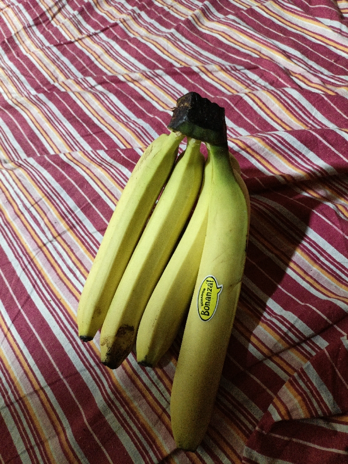 - "A bunch of four yellow bananas with green-tinged stems and dark brown tips is centrally positioned on a red, white, and yellow striped fabric surface" by FM-rZca83, licensed under CC BY 4.0