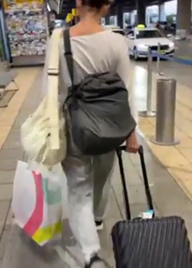 A woman walks away from the camera at an airport, dragging a rolling suitcase with her right hand. A large shoulder bag is on her left shoulder, and a colorful shopping bag is in her left hand. The airport terminal has benches, newsstands, and taxis parked on the street outside. The woman is wearing a light-colored top and light-colored pants.