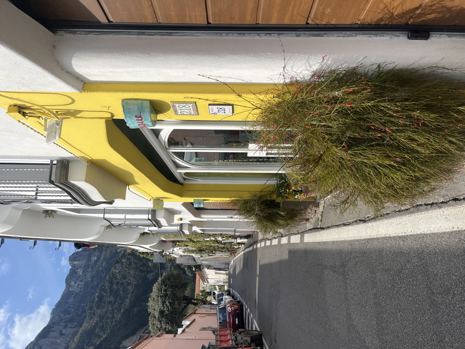 This image captures an ascending asphalt street scene in Arienzo, Italy. On the right, a multi-story building features a bright yellow facade around a shop entrance. The entrance consists of an arched glass doorway reflecting the street. Above the doorway, a light blue elongated sign displays "tique," and two address plates below it both read "218." A security light fixture with visible wiring is mounted above the sign. To the right of the yellow section, against a white wall, a large, dense green bush with numerous small red tubular flowers grows. Another smaller potted plant is visible further back. A brown wooden door or gate is partially seen on the far right edge. The asphalt street curves slightly to the left, marked by a continuous white line bordering a narrow, cracked concrete curb on its right. Multiple vehicles are parked along the left side of the street, including a red utility vehicle in the foreground and several small red cars further up the incline. Buildings line the left side of the road, displaying light-colored (pink and white) facades with balconies featuring dark wrought iron railings and some green foliage. A solitary figure, wearing a dark top, is partially visible leaning over a balcony railing on an upper floor of a white building in the mid-ground left. The background is dominated by steep, green-forested mountains under a clear blue sky. Shadows indicate bright sunlight.