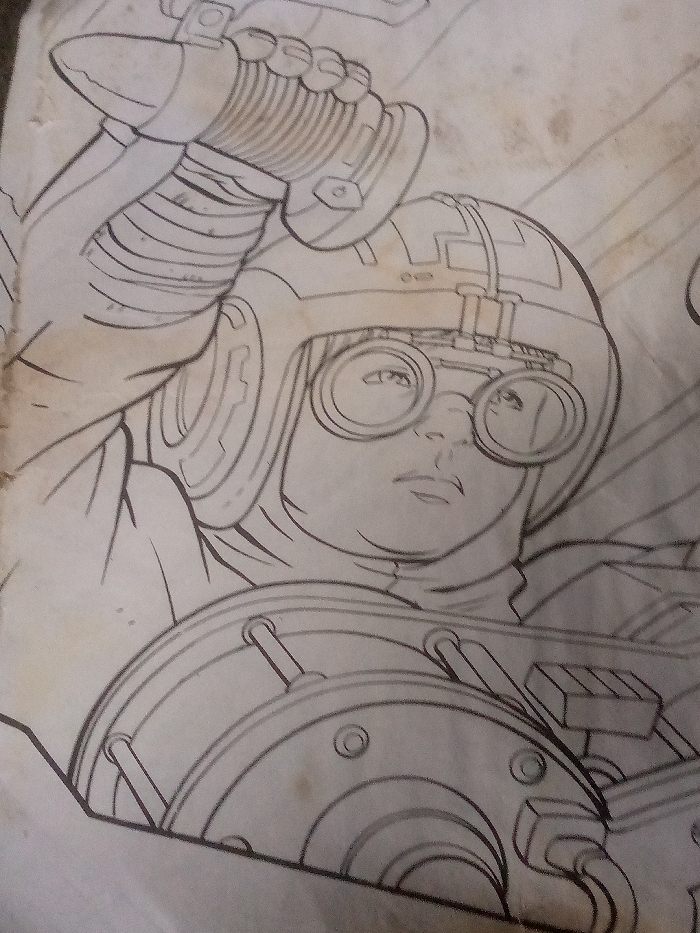 This is a line art illustration on discolored, aged paper, potentially from a coloring book or comic, depicting an individual in a futuristic or retro-futuristic cockpit or vehicle