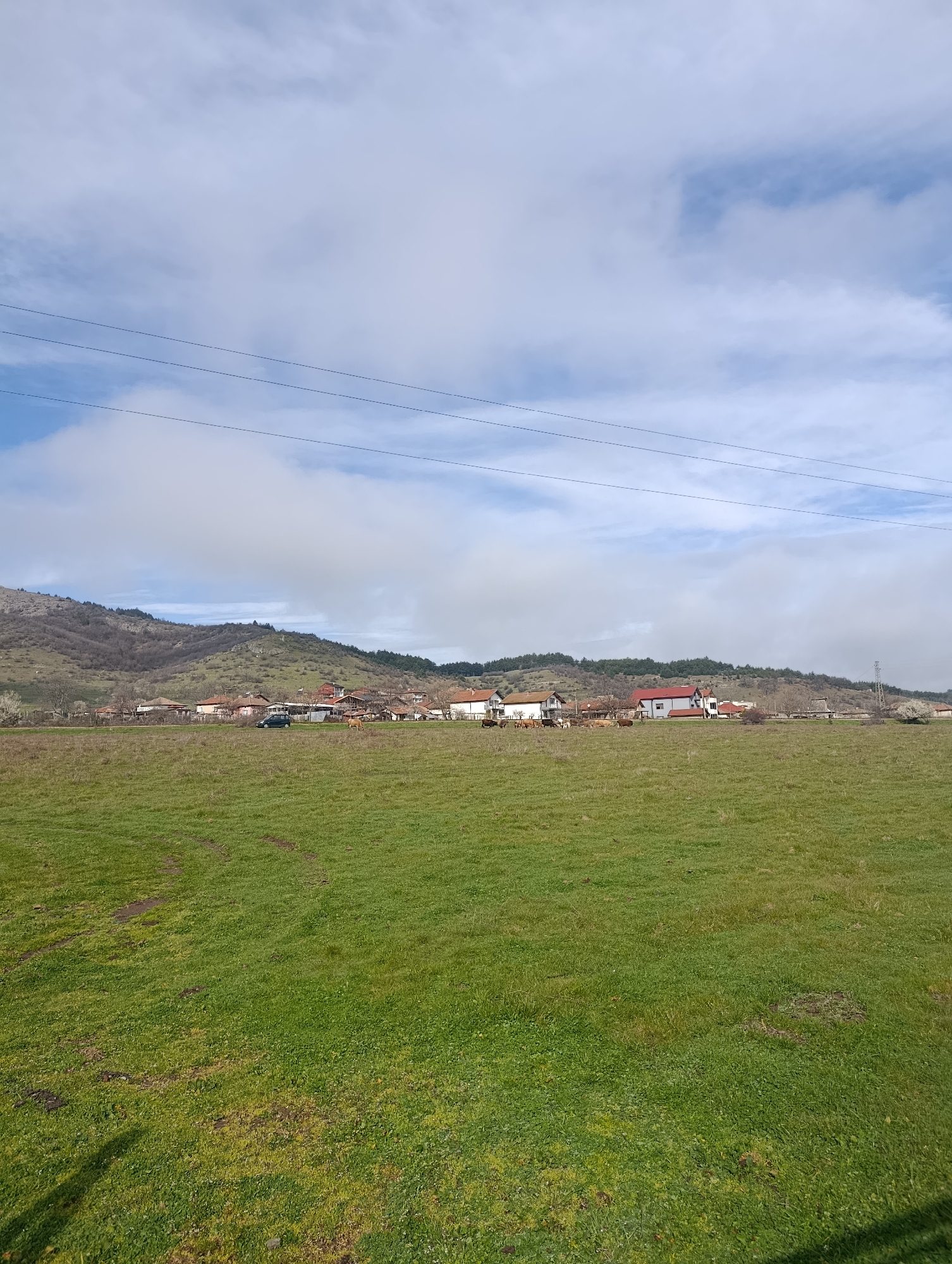 The image depicts a rural landscape in Shiroko pole, Bulgaria, under a partially cloudy sky. The foreground comprises a vast expanse of green grass with visible tire tracks and areas of less verdant ground. In the mid-ground, a village stretches horizontally, featuring numerous single to two-story houses with predominantly red-tiled roofs and light-colored facades. A dark-colored sedan is parked on a road within the village, slightly left of the image center. To the right of the sedan, approximately 8-10 light brown and dark brown cattle are visible, grazing or standing in a field immediately adjacent to the village structures. Three parallel power lines traverse the upper mid-ground, running horizontally across the scene, with a metal lattice-work utility pole discernible on the far right. The background features undulating hills, partially covered with sparse deciduous trees and some evergreen clusters. No human figures are discernible in the scene.