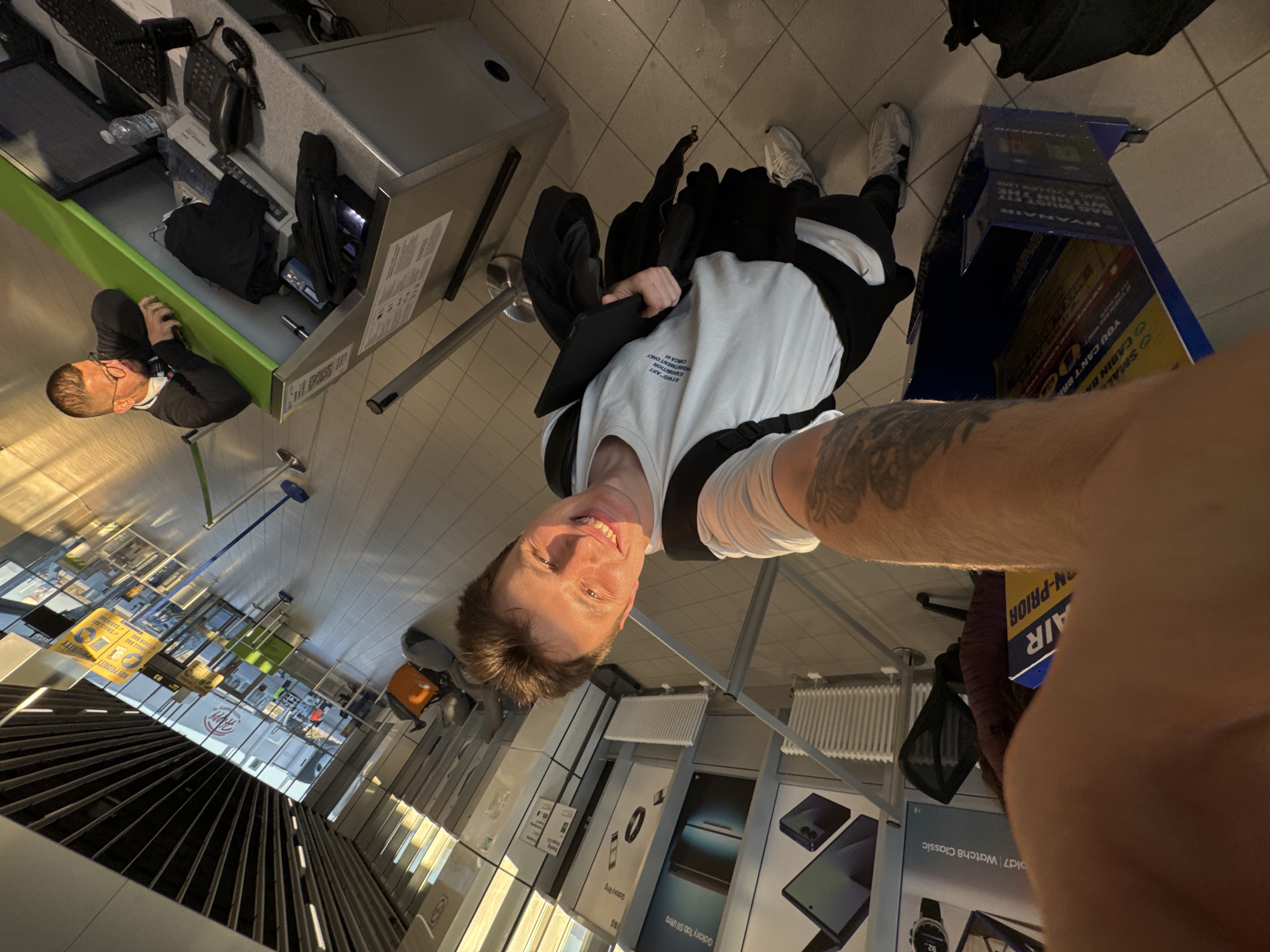 A selfie-style photograph shows a young man at Sofia Airport in Bulgaria