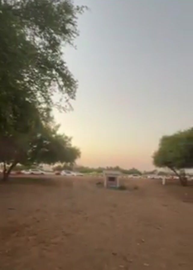 dirt ground area with trees and parked cars under a light sky with a hint of sunset. A gray pole covered in stickers is in the foreground. There is a small, rectangular structure in the distance. The camera pans slightly to the right. The call to prayer can be heard.