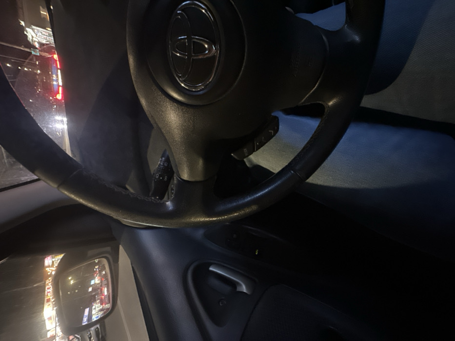 The image depicts an interior perspective from the driver's seat of a vehicle at night