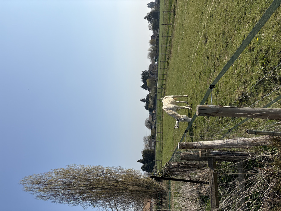 The scene depicts a rural landscape in Bû, France, under a clear, bright blue sky. In the foreground, a multi-strand wire fence supported by weathered wooden posts extends diagonally from the lower left to the mid-right, partially obscured by dry brush. A tall, slender deciduous tree with visible light green buds and small leaves occupies the left third of the image. A light green electric fence tape is affixed to the wooden posts, running through the mid-ground. Within a vibrant green pasture, a white horse is observed in the mid-ground, actively grazing with its head lowered to the grass. Its ribs are discernible beneath its coat. Behind this horse, a second white equine is partially visible closer to the ground, appearing to be lying down or in a very low position, with its head and neck distinguishable. Another fence line, consisting of wooden posts and wire, stretches horizontally across the mid-ground, bordering the pasture. The background features scattered residential structures and various deciduous trees, indicating a distant village or settlement. The entire scene is illuminated by direct sunlight.