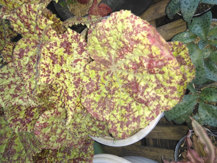 This image depicts a close-up of variegated foliage from a potted plant, identified as being located in Kladno, Czechia. The central subject is a plant displaying large, textured leaves that exhibit a prominent light green to yellowish-green base color mottled with irregular, dense patches of deep red or burgundy, creating a speckled pattern. The leaves possess a slightly rugose surface and appear to have fine, light-colored hairs, particularly along the veins and margins. The primary plant is contained within a round, light-colored (possibly white or pale grey) plastic pot, positioned on a surface made of parallel wooden slats. Surrounding the main plant, partially visible in the background and foreground, are additional smaller potted plants. To the immediate right and below the central plant, several smaller dark-potted plants with elongated, dark green leaves featuring darker spots are present. To the far left foreground, another small plant with reddish-brown, possibly serrated or undulating leaves is visible in a dark pot. The scene is evenly lit, indicating either indoor conditions or a shaded outdoor environment. No people, specific actions, or direct interactions are depicted.