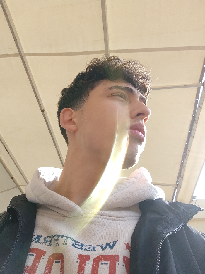 A forensic description of the scene in Jibb as-Safa, Syria: The image depicts the right profile of a light-skinned male individual, appearing to be a young adult, with short, dark, curly hair and faded sides. He is looking upwards and slightly to the right, with his lips slightly parted. A prominent vertical lens flare, appearing as a bright, elongated streak, extends from his upper face down to his neck, partially obscuring his features. The individual is wearing a white hooded sweatshirt underneath a dark, possibly black or navy blue, zip-up jacket. The white hoodie features partially visible, reversed text and star graphics on the front, including what appears to be "WESTERN" and "RIDE". The background consists of an overhead, light-colored structure, likely a canopy or awning, with visible rectangular support beams. The environment is brightly lit, with a strong light source contributing to the lens flare from the upper right quadrant of the image.