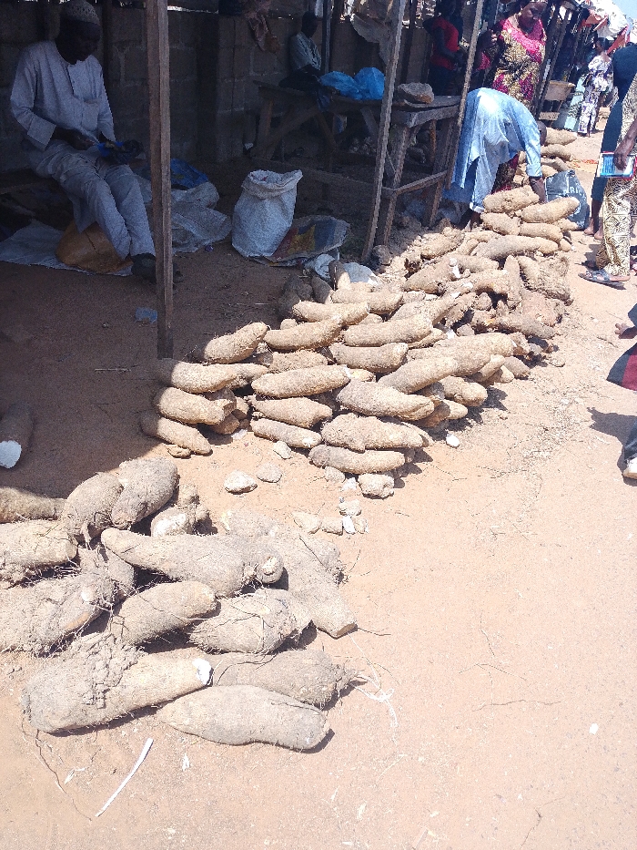 The image depicts an outdoor market scene in Sabon Tasha, Nigeria, characterized by dry, reddish-brown sandy ground under daylight. In the foreground and mid-ground, a substantial quantity of raw, unpeeled yams are displayed, piled and scattered directly on the ground. To the left, beneath a rudimentary wooden-posted structure offering shade, a man wearing a light-colored long-sleeved garment and a cap is seated on a brown bag, appearing to be handling small items in his lap. Behind him, a white sack and a blue plastic bag are visible. Towards the center-right, another man in a light blue long-sleeved garment is bent over, interacting with the piled yams. In the background, partially obscured, several other individuals are present, suggesting ongoing market activity; one person to the far right is wearing patterned clothing. Wooden planks and another simple table are visible under the structure in the background.