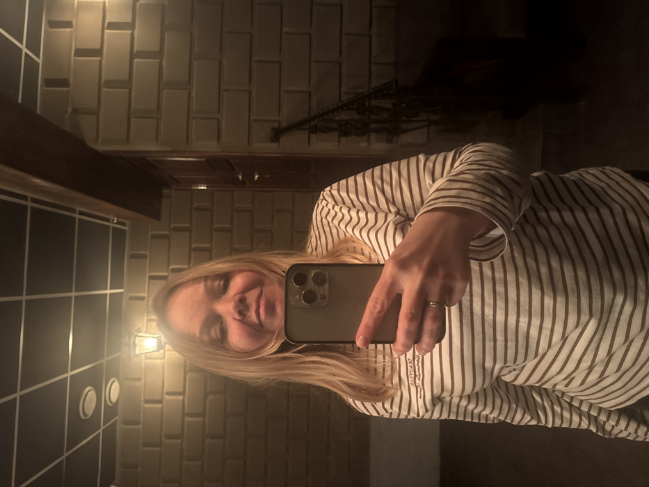 A blonde woman is depicted in an indoor mirror selfie, shown from the upper torso, with a slight smile and her eyes partially closed