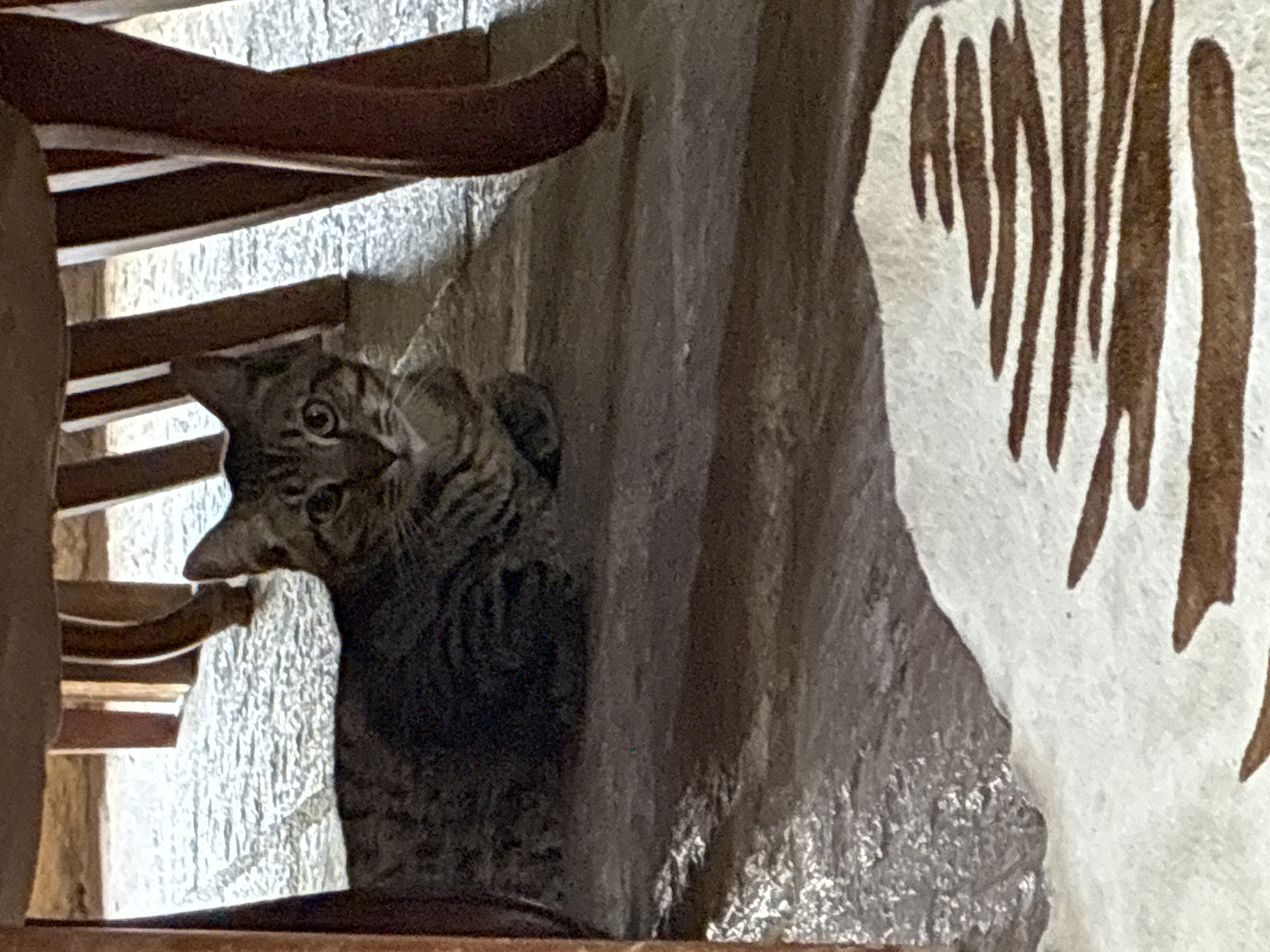 A tabby cat is sitting on a brown chair, with its head tilted upwards and looking to the left. Part of the chair is visible around the cat, with wooden slats and a curved armrest. Behind the chair and the cat is a textured, possibly cement wall. To the right of the wall, there is a patterned object with brown and white stripes. The image is slightly angled and shows a close-up view of the cat and its surroundings. The city of Cañada de Madero, Mexico, is not visibly discernable in the image.
