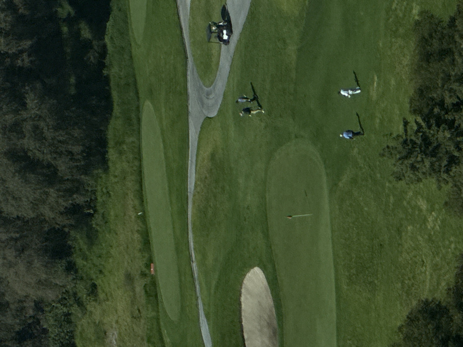 This image presents an elevated view of a golf course situated in Heroica Puebla de Zaragoza, Mexico, under bright daylight conditions. The environment consists of expansive, manicured green lawns, including multiple distinct putting greens and fairways. Dense, dark green natural foliage and trees frame the upper background and lower foreground areas of the scene. Specific course features include: * At least four separate greens. One in the lower-middle features a red flagstick, while another in the upper-left exhibits a white flagstick and a small orange marker. * A large, light-colored sand bunker is visible on the left side, immediately adjacent to a green. * Gray, paved golf cart paths traverse the course, forming intersections and winding through the fairways. Four individuals, presumed to be golfers, are present on the course: * Two individuals are observed walking on the grass in the upper-middle section of the image, near a golf cart path. One is dressed in dark attire and lighter pants, while the other wears dark clothing. * A third individual, wearing a light blue shirt and dark pants, walks on the grass in the lower-middle section. * A fourth individual, dressed in predominantly white clothing, is walking on the grass in the lower-middle section, positioned slightly behind the person in the blue shirt. A dark-colored golf cart is present on a paved cart path in the middle-right area of the frame, facing away from the viewer. All visible individuals appear to be walking, with no direct interactions or specific actions beyond movement across the course. Shadows cast by the individuals and objects indicate a high sun angle.