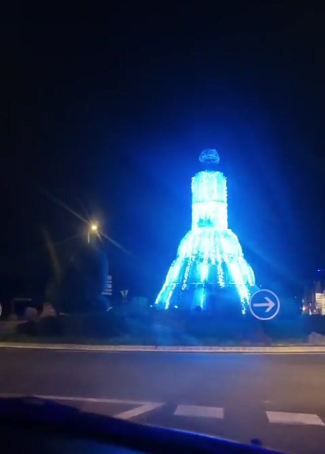 roadside view of a roundabout in France at night. In the center of the roundabout is a sculpture lit up with blue lights. The sculpture has a bulbous base with a stacked structure above it, topped by a spherical shape at the very top. To the left of the roundabout is a tall street lamp. A blue sign with a white arrow pointing to the right is visible on the right edge of the roundabout. The video is taken from inside a car as it approaches the roundabout. The bottom of the windshield is visible in the foreground.