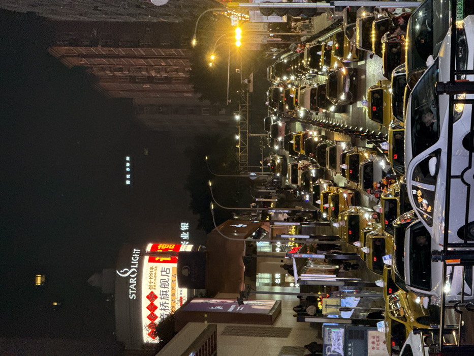 The image depicts a nighttime urban scene in Liangjiang, China, characterized by severe traffic congestion on an uphill multi-lane road