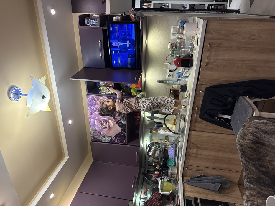 The image depicts an indoor kitchen setting in Sofia, Bulgaria. A young child, appearing to be female, with dark hair, stands on a light-colored kitchen countertop. She wears a light brown long-sleeved top, leopard print pants, and white socks. The child is actively reaching with both hands into an open, dark purple upper cabinet, which reveals various packaged contents. Her left hand holds a yellow utensil or toy. The kitchen features dark purple upper cabinets, some adorned with a large purple rose motif, and light brown wood-grain lower cabinets, all with brushed metal handles. The countertop surrounding the child is cluttered with numerous kitchen items. To the child's left, a blender with green contents, a metal dish rack with washed dishes, and a sink with a faucet are visible. A collection of knives and other utensils are mounted on the backsplash above the sink. To the child's right, on the countertop, are a red espresso machine, various glass bowls, and miscellaneous items. A small flat-screen television is mounted beneath an upper cabinet to the right of the child, displaying a male presenter in a suit against a blue background. The ceiling is a light beige with recessed spotlights and a central, decorative, multi-faceted light fixture emitting a blue and yellow glow. In the lower-left foreground, a brindle-patterned dog is partially visible on the floor or furniture, facing away from the camera. A chair with a striped cushion and a black jacket draped over it is positioned in the lower center.