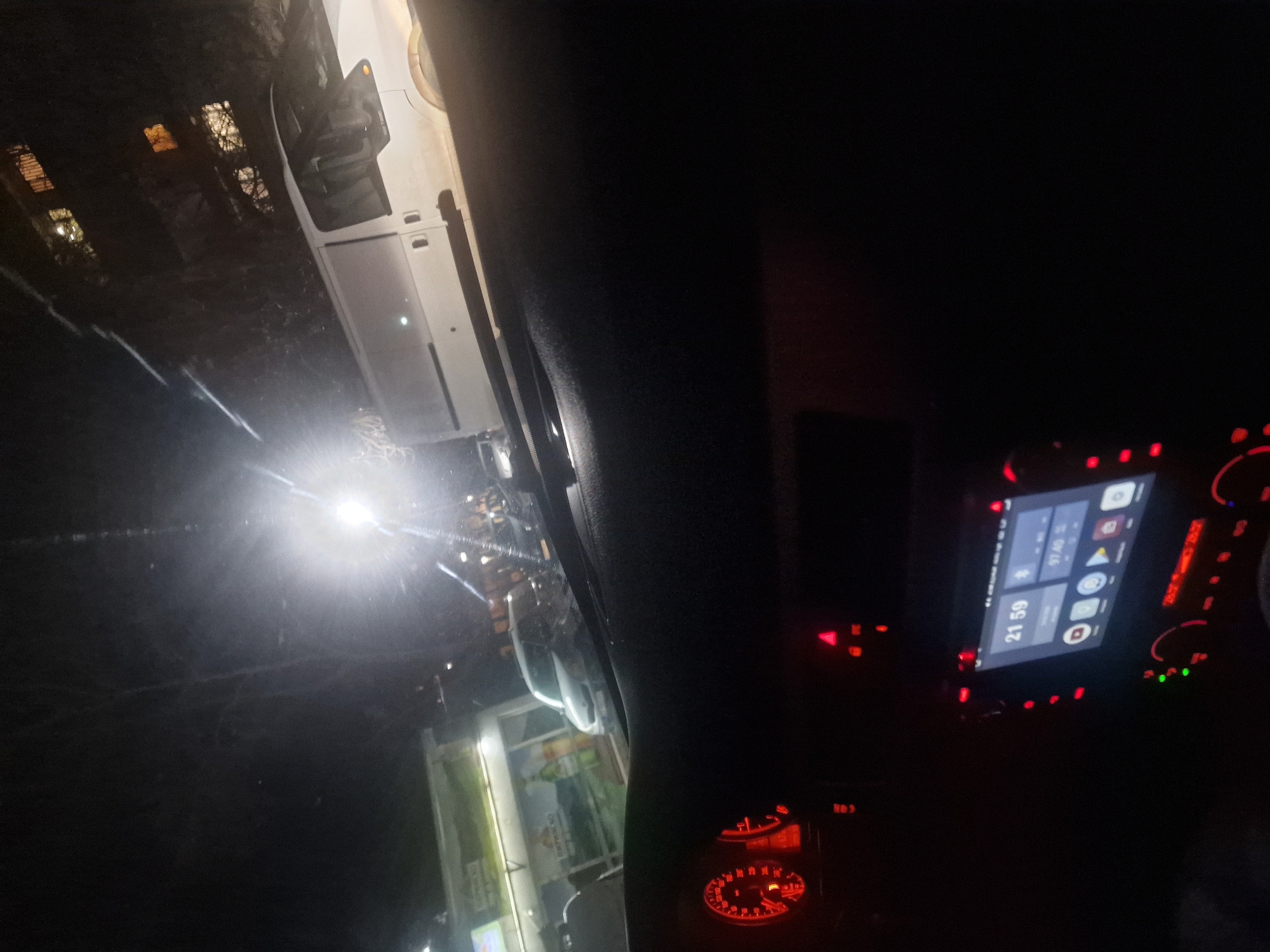 The image depicts a nighttime scene viewed from the interior of a stationary vehicle in an urban or semi-urban environment within the city of Unknown, Unknown