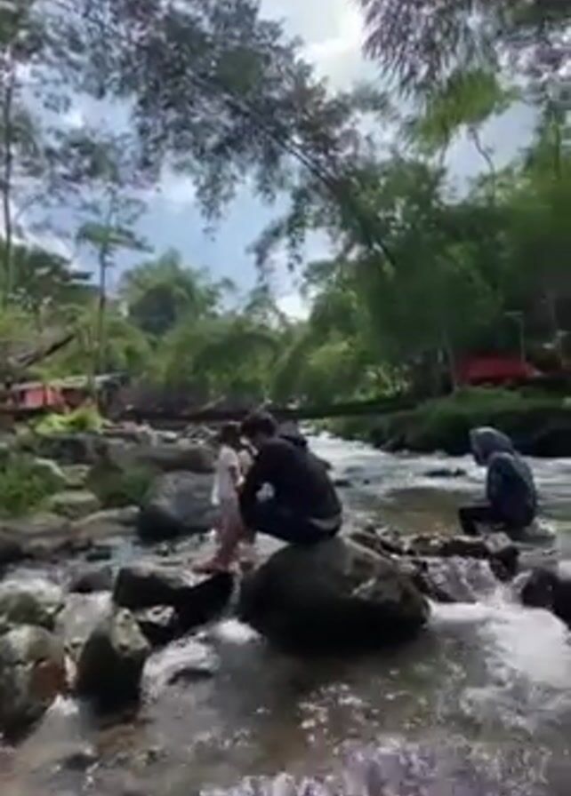 lively outdoor scene. A person is sitting on a large rock in the middle of a rocky river, with a child nearby. Lush green trees surround the river, and wooden structures with red roofs are visible in the background. The camera then shifts to a woman in a black hijab taking a selfie in the river. Another person is sitting in the water behind her. The river flows rapidly around the rocks and people, creating a dynamic and refreshing atmosphere.