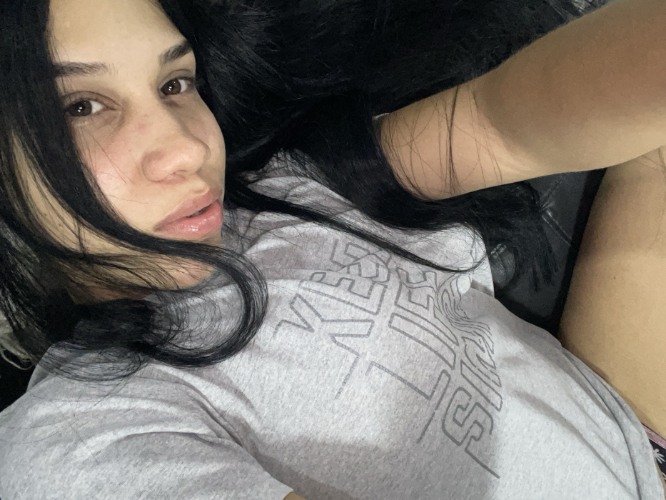 The image displays a close-up, angled portrait of a single female subject indoors. She possesses long, dark, wavy hair, dark brown eyes, and a light to medium complexion with subtle facial redness around the nose and cheeks. Her lips appear full and glossy. She is wearing a light grey short-sleeved t-shirt with the text "KEEP LIFE SIMPLE" imprinted in a bold, outlined font. Her torso and upper thighs are visible, with a faint glimpse of patterned fabric, likely part of an undergarment or shorts, at the lower left frame edge. The subject is gazing directly into the camera, her head slightly tilted. The background is dark and indistinct, revealing a black, textured surface consistent with a piece of furniture such as a couch or chair. There is no visual information within the image to determine the specific location in the city of Altagracia, Venezuela.