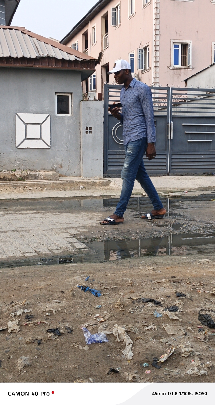 An outdoor, eye-level photograph captured in Ado, Nigeria, depicts an adult male walking from left to right across a street or paved area