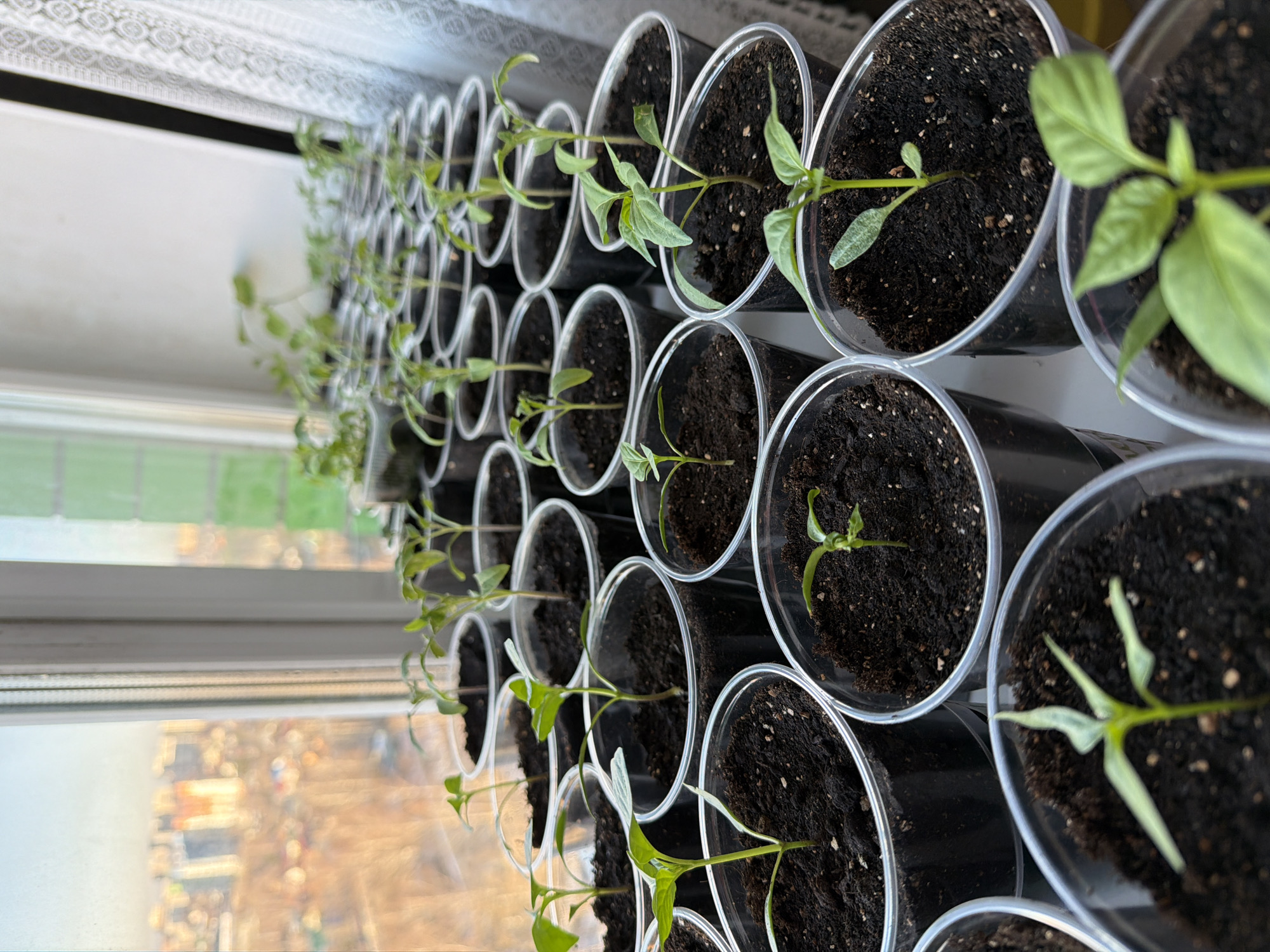 - "A high-angle shot shows numerous clear plastic cups filled with dark soil, each containing a small green plant, seemingly seedlings, arranged in neat rows on a windowsill" by FM-lXTRi1, licensed under CC BY 4.0