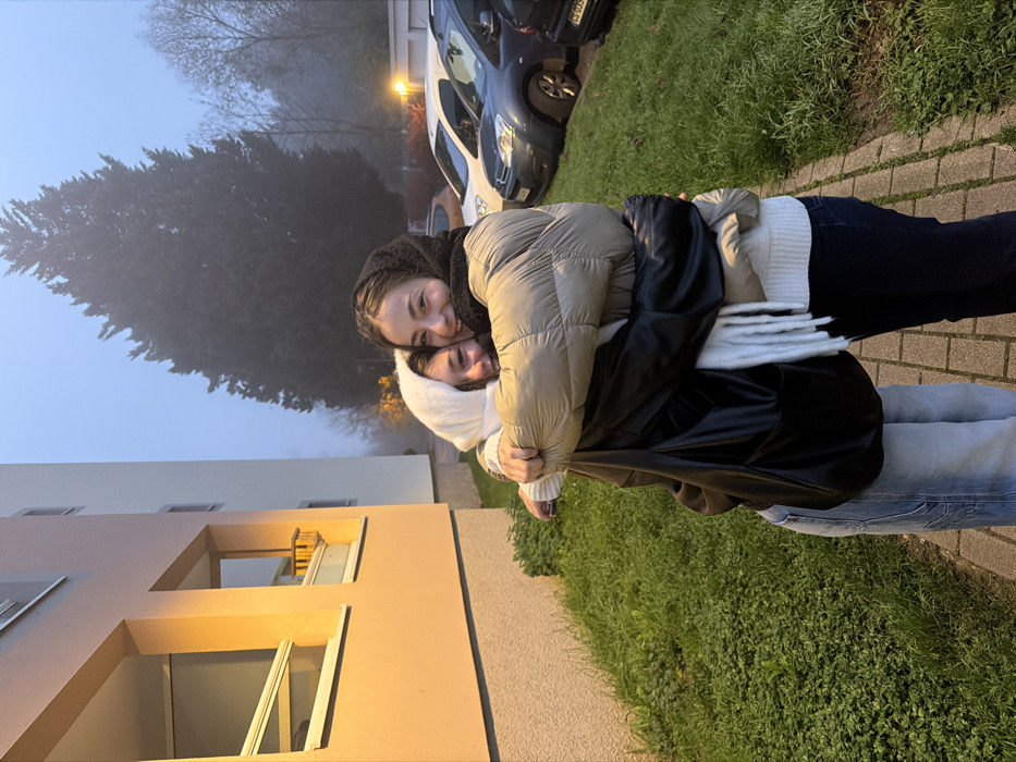 The image displays two young females embracing on a paved pathway in a residential area of Strasbourg, France. The female on the right, facing the viewer, smiles broadly, dressed in a dark head covering, a light olive puffer jacket, a white knitted scarf, and dark trousers; her arms are wrapped around the other individual. The female on the left, partially obscured, wears a light-colored hood, a dark jacket, and light blue jeans, with her right arm around the first individual. Adjacent to the pathway on the left is a grassy verge, leading to a multi-story apartment building featuring a peach-colored lower facade and illuminated windows. In the background to the right, a parking area contains several vehicles, including a white van and a dark hatchback, illuminated by a yellow streetlamp. A large, dark coniferous tree dominates the distant background, obscured by atmospheric conditions consistent with mist or fog, along with other bare trees. The sky is a uniform light grey.
